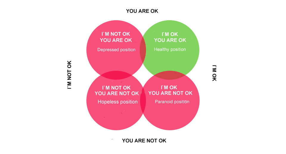 The attitude of great yoga teachers and gurus is the same towards everyone – both towards princes and the poor (Maheshwarananda, 1987). In TA the concept of OK Corral refers to 4 life or existential positions that we change during a lifetime depending on the situations we are in (I am ok – You are ok; I am ok – You are not ok; I am not ok – You are ok, and I'm not ok – You're not ok; see Figure below). The 'I am OK, You are OK' position is the healthiest one and a therapist must represent it in his/her work. This suggests that we are all equal as human beings, in addition to showing respect for and understanding the importance of every person we meet, regardless of whether we work as therapists, yoga instructors, or not.